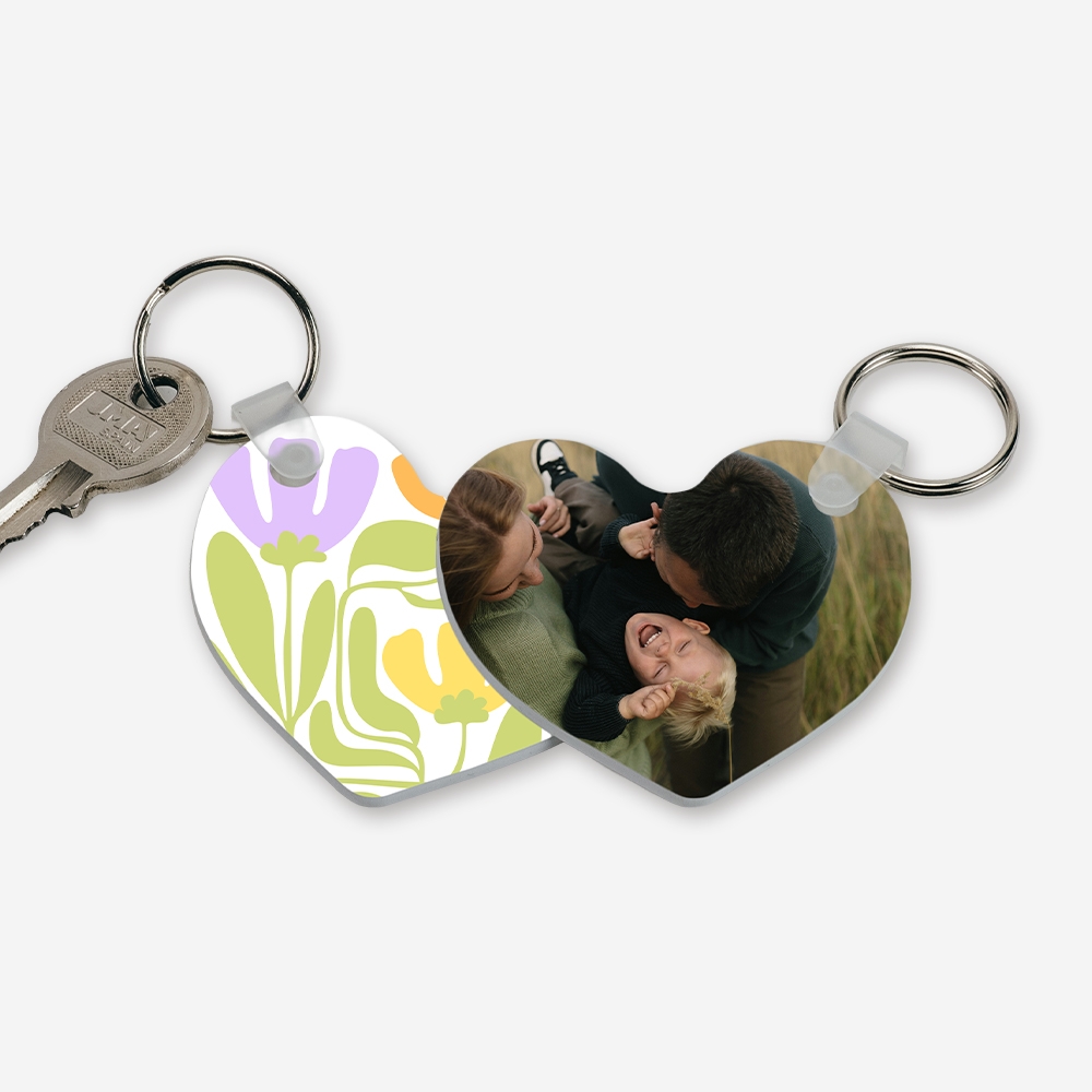 Com formato de coração e personalização total (100%) em ambas as faces, este porta-chaves transforma qualquer foto ou frase num presente romântico e inesquecível.